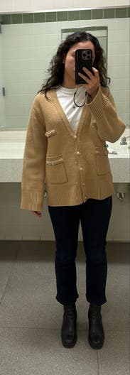 I wore this sweater at least two times a week. It is such great quality and really elevates an outfit with the gold buttons.