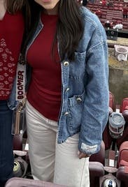 Perfect jean jacket for everyday wear or a more casual work environment! The pockets were perfect as a mini bag replacement for an on-the-go work event (lip gloss, money, eye drops, etc.). Fits TTS with an oversized look. Size down if you don't want the oversized, boxy fit. Sad to let this one go!