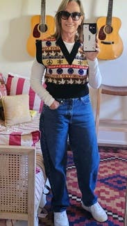 Super fun vest — little oversized fit but looks very cute with turtleneck or button ups! Got so many compliments in it :)