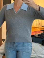 This Sandro sweater features a contrasting light blue collar that adds a preppy touch to the classic grey knit. Pair it with tailored trousers and loafers for a polished, professional look.