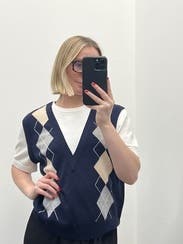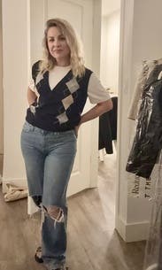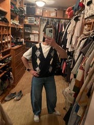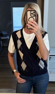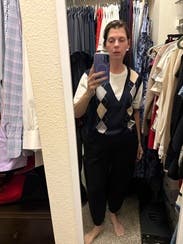 I received a lot of compliments on this one. The shirt under the vest is also sweater material so it looks elevated. Fits true to size. I called it grandpa chic.