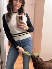 Such a sporty, sleek classic sweater vest style. Almost bought it, it was so effortless but classic.