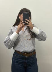 This button-up is the perfect oversized fit for tucking and styling! I'd recommend ordering your true size or even sizing down depending on the fit you want. The pale blue, white, and subtle brown color combo is so stylish, making it a great top to dress up or down for your day-to-day. I love the v-neck style and how you can roll the sleeves! It's super versatile and looks chic.