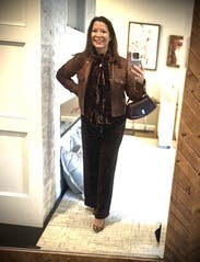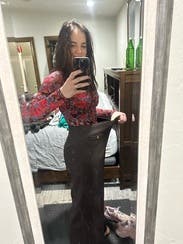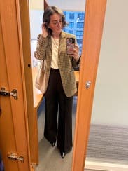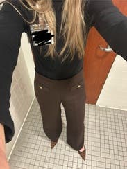 These deep brown pants have a lovely color and a chic gold button detail on the front. They include pockets and a hidden side zip, which is a nice touch. The fit is loose overall and not particularly flattering for petite frames, with a length that falls slightly long but workable with heels. The fabric feels a little itchy. I wore them once and loved the color, but I probably won’t wear them again. Stylish in design, though the fit and texture may not work for everyone