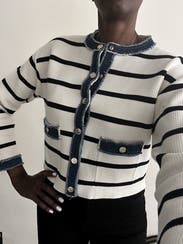 The Stripey Cardigan with Denim Details by Sandro blends playful stripes with denim accents for a casual yet refined look. Its cozy design is perfect for layering over both dresses and jeans, giving you an effortlessly stylish outfit for any casual occasion.