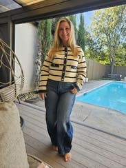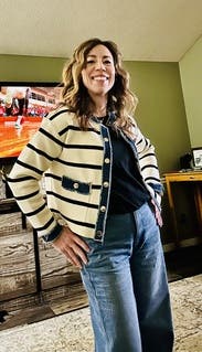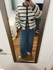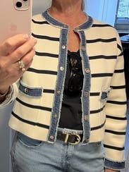 This cardigan style jacket has a denim border which is perfect for pairing with anything denim on the bottom. IG @bethielife