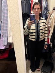 I love this! Well-made sweater! It would be beautiful with jeans but it's just too hot outside right now! I didn't know how thick this material was. I'm able to wear it at work since it's usually cold with the air conditioning. It did run big. They recommended a 4 and I rented a 3 based on the reviews. A three was even a bit big. I still don't know if the stripes are black or navy. So I guess it could go either way 😉