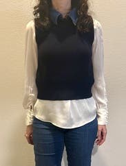 This top looks great, but there are two reasons I only gave it four stars. First, the collar is sewn at the back and can't be removed, although the snap fasteners are still there, so you still have to snap it in place every time you wear it, because you can't put it on with the collar attached since it’s very narrow. Second, the fabric is itchy; the first time I wore it, I only had a cami underneath, and I was in a bad mood all day because of how itchy the sweater vest made me feel. I do have sensitive skin, though.