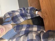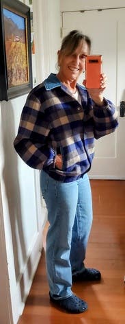 Looks great with jeans since the collar matches. Lots of compliments. Think you could size up or down and it’d be fine