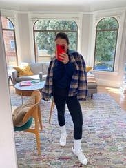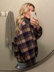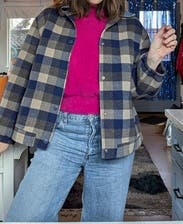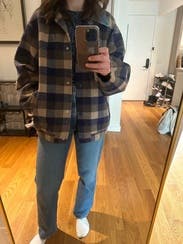 The denim collar on this classic flannel shacket from Sandro is giving lumberjack vibes circa the 1980s and we are here for it.