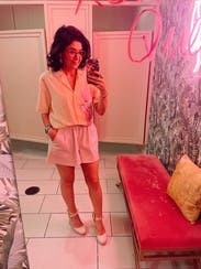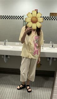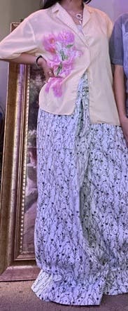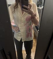 I love this blouse. You can wear it tucked, half-tucked, out and buttoned or out and unbuttoned. The floral design is gorgeous with soft pinks. The blouse color is a soft yellow. I wore this several times. I wore it to run errands, go out to dinner, and an outdoor activity. I highly recommend this rental piece. Large was my recommended size, but I chose medium and it fit perfectly.