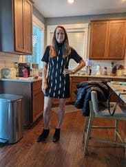 I paired this with some black boots for a work event. It's a flattering dress but also a professional length with a fun design.