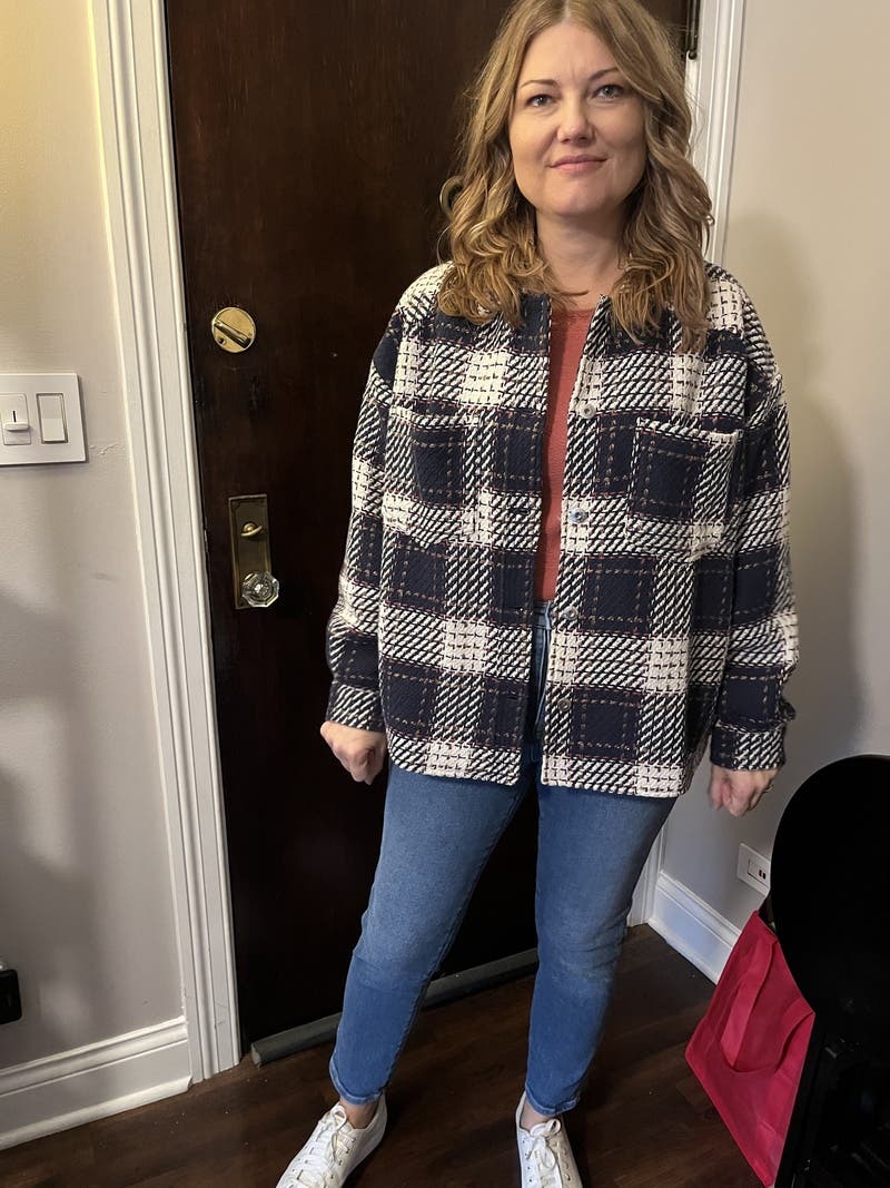 Keep it casual in this blue plaid shacket by Scotch & Soda paired with your favorite distressed jeans for weekend errand runs.