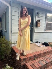 So gorg! Perfect for the butter yellow trend. Loved the ruffles. Thin material light and breezy but does show the spanx seam but oh well. Perf semi formal vibes