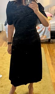 This dress was a last minute sub for a different dress but this was such a happy accident. The ruching added a cool element to the dress & it made me look taller & slim ! So many compliments & I felt sooo good it in . No shapewear necessary