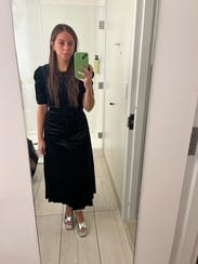 The velvet reflects light more than the usual dark velvet so it gives the black color a little sparkle in a fun way. Runs beneath the calves, warm enough for fall with a coat on top