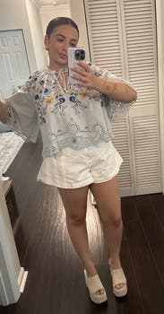 Initially, I thought there was too much material and I was lost it in - but the color and the embroidery are beautiful. I got many compliments on it. It is short waisted, especially for those of us that are taller - but cure with high waisted jeans.