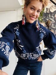 This Sea New York sweater features intricate blue and white embroidery, giving it a folk-inspired aesthetic. Pair it with a neutral skirt and boots for a chic, bohemian look.