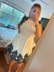 Cute dress but a little big around the waist. Dress hit the knees just right and the embroidery was cute too. The extra room at the waist was a little too tiny for me. Made me feel slightly bigger in that area rather than slimmer.