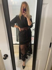 Yes, there’s a 20-something Goth Girl living in my 🖤 I find it difficult to resist black lace. To give this a little more shape, I sized down from my usual 4 to a 2 and it worked out perfectly. Just enough room for my 32DDD’s and my 36” hips. Of course it’s a midi on the model and a maxi on me (5’2”). The body of the dress is a medium thickness and easy to wear as it’s not at all clingy. Works with a moderate heel or flats. Thinking I could add a leather jacket and boots for a more edgy look during cooler months. Love this brand and would def recommend.