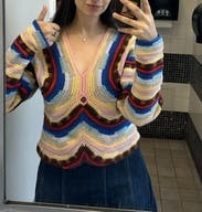 Multicolored knit (100% Merino Wool). Sweater. Long sleeves. V-neck. Pull on. 21.5" from shoulder to hemline. Imported.