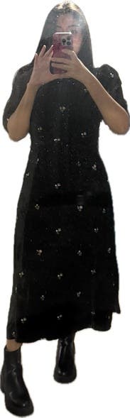 I found this somewhat oversized and wish the waist on the 0 were less loose. Not the most flattering but very comfy. I loved the black velvet with the floral stitching but it did give sort of Little House on the Prairie vibes. Tried to balance it with a moto boot.