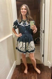 Really great dress! A little on the short side for me. But still very flattering! I received so many compliments. I could have sized up for more length n a little extra room.