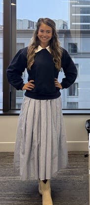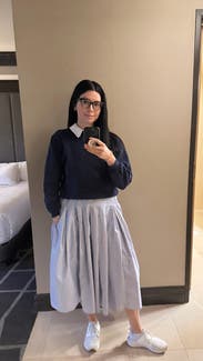 This gives school vibes which I thought were fun. Warm enough for fall even though the skirt is very cottony. High quality. Takes a minute to put on because of all the pieces. Super comfy. Pockets! I got an XS because of the other reviews. Def size down!