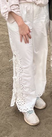 Every time I wore these pants I got several compliments! Light weight, airy, with just a pop of leg showing thru the patterned details. Great for the summer!