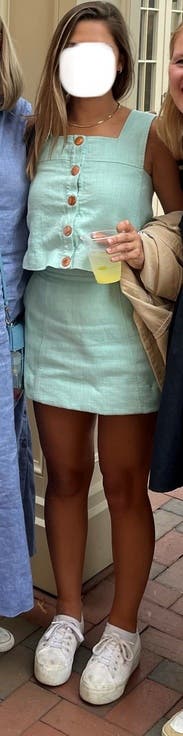 Short skirt that's long enough to wear without being worried of "am I too old to wear this?" Has pockets. Fit well for someone who struggles to find skirts that fit around hip area. So comfortable that I forgot I was even wearing it. Paired with the matching top.