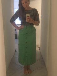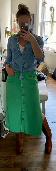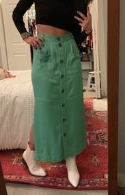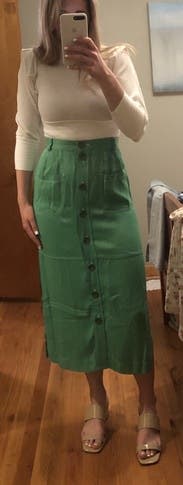 I loved the color, but this skirt is better in theory than in practice - the buttons gaped, it wrinkled very quickly, and the other reviews that mention that it rubs small in the waist / very high waisted are accurate