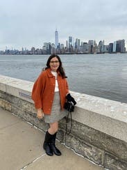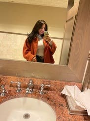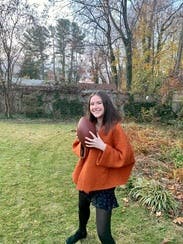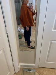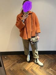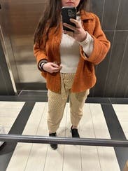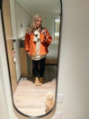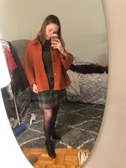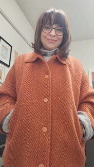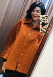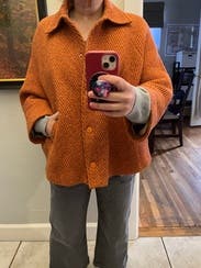 One of my favorites. Rich orange/red color for fall with wool texture, but the key is the flattering, swing cut. I got many compliments and considered purchasing. Note the photo is my daughter who borrowed it while home for Thanksgiving.