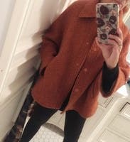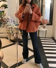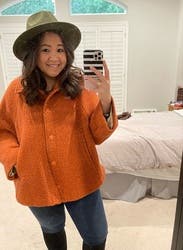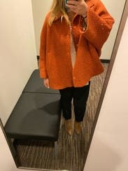 The cut of this jacket is so beautiful. It hangs almost like a balloon and is really flattering. The color is also a really rich pumpkin, perfect for this time of year. Wore it to thanksgiving dinner and got loads of compliments. Single complaint is that the billowy sleeves make it awkward to carry a purse over your shoulder so it was a bit tough to wear to work. Handbags only, ladies. Otherwise, gorgeous