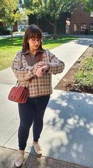 I adore this bag. It holds more than you’d think – I currently have a small but bulky wallet, compact mirror, keys, 5 lip glosses (I have a problem), allergy nasal spray, 2 pens and a bunch of receipts in there. It definitely is a cross-body bag, or at least it is for me. The leather strap has multiple holes so you can adjust the length, and it goes from cross-body length to shoulder bag length. It’s cute for fall and I’m telling myself it’s not a year-round bag so I don’t buy it (though I want to).