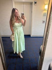 I was sad to return this! I wore it for a garden party. Since the straps aren’t adjustable they did fall off my shoulders quite a bit, but it wasn’t a huge deal to me. I wore it with a strapless bra and it fit great.