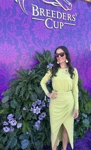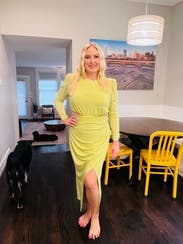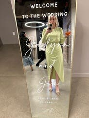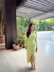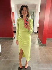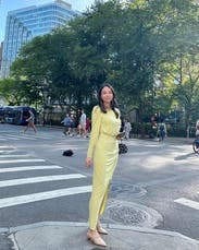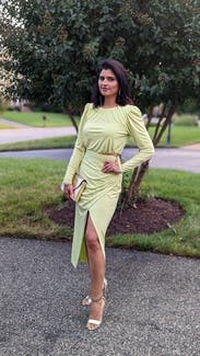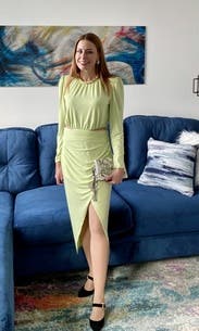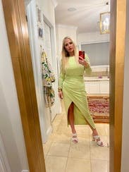 The amount of compliments I got in this was crazy, its a gorgeous muted neon green color, and the wrap around the waist naturally keeps in your curves, I didn't have to wear spanx or anything. Loved it and will definitely rent again