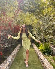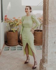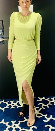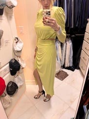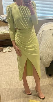 Wore this to fiesta themed after wedding party. I loved the vibrant green, the fit was flattering and that slit is 🤌🏼, only con to this piece is that the mid section has no give. Wasn’t necessarily uncomfortable for me, but it may be l for the others. Will most definitely rent again