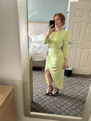 Really loved this dress. The color was fun, the cut/shape were unique, and it was streeeetttchyyy, making it even more comfortable. My only “eh” was that the slit fell open when sitting, so just be mindful of that. I got lots of compliments!