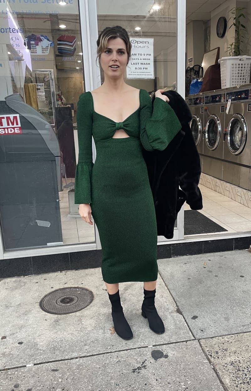 Green knit (45% Polyamide, 42% Viscose, 13% Metallized Fiber). Hourglass. Long sleeves. Sweetheart. Pull on. 51.5" from shoulder to hemline. Imported.