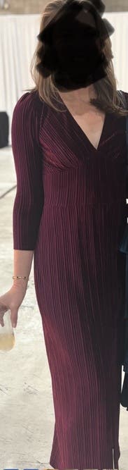 Loved this dress. The burgundy color is flattering and the fabric was perfect for a winter formal event. Neckline is a bit low but a sticky bra takes care of that. Would definitely wear again!