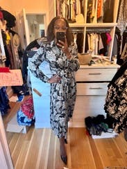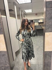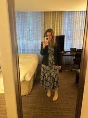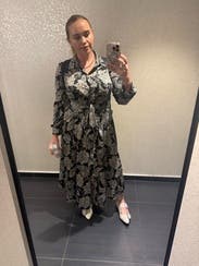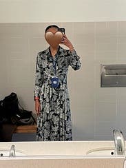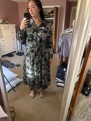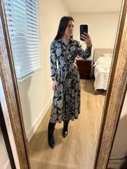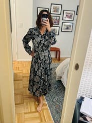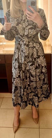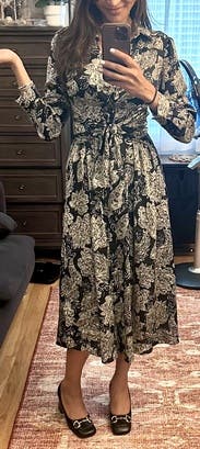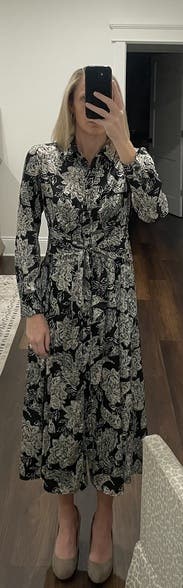 This dress hit all the marks!! Flattering, comfortable, and a really pretty print. I also LOVE a dress that doesn’t wrinkle so no steaming before wearing. The tie in the front nicely accentuates the waist. As noted in the header I will absolutely be renting this again.