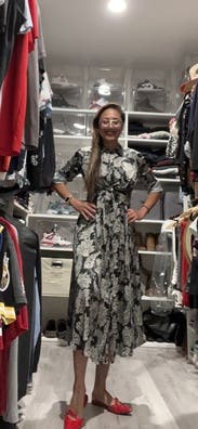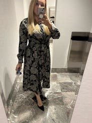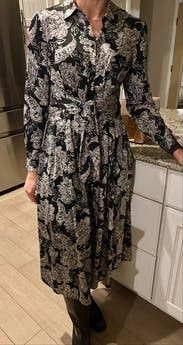 This Shoshanna dress features a classic silhouette with a botanical print, offering a timeless and sophisticated look. Pair it with neutral heels for an elegant ensemble suitable for various occasions.