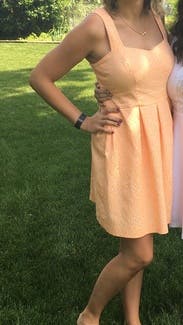 The dress was a vibrant and unique orange and white that I didn't expect to love so much. I loved the neckline and the overall style of the dress, though I found it ran very large. I originally ordered the size 8 but it was practically falling off of me. RTR over nighted me the size 6 which fit much better, though there was still room in the bust. I got a lot of compliments on the cut and color of the dress at my sister-in-law's wedding rehearsal dinner. I'd rent this dress again in a heartbeat.
