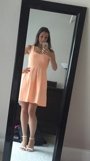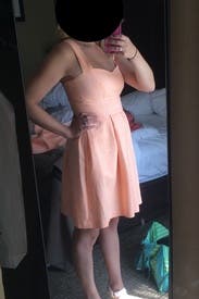 I absolutely loved this dress! I wish I could keep this one. It's much more coral in person than it looks on the model, which you can kind of tell from this picture. I'm usually between a 0 and a 2. I tried on the 2 and it was way too big, literally hanging off of me, but the 0 fit perfectly. I wore it with a strapless bra so I didn't have to worry about the straps showing, and that worked great. The length came to just above my knee (I am short). The fabric was really light and breathable and comfortable, but study enough that it wasn't see-through. Loved this dress and would highly recommend it!