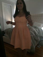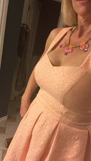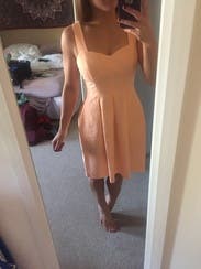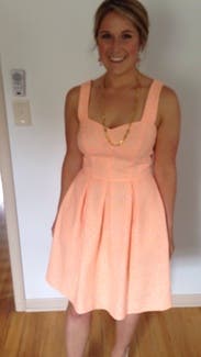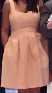Pictures do not do this dress justice. I was not expecting the dress to be a bright orange (looks more peach on website and pictures) but the color was perfect for a spring bridal shower. I am usually a 4 or 6 in this designer depending on the style of the dress....the 4 fit, but it was a little tight under the arms causing a little of that unattractive underarm fat so I went with the 6. It is a fun cut with the full skirt and I actually did not end up wearing a bra with it because I didn't need to -not to say this is dress is difficult to wear a bra with. And as always, the pockets were an added bonus!