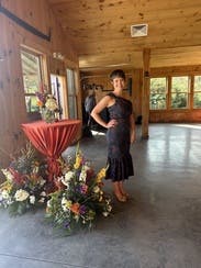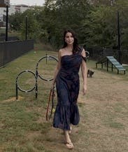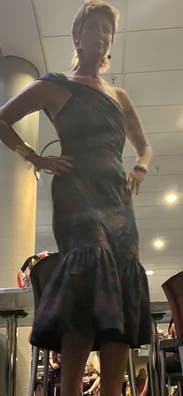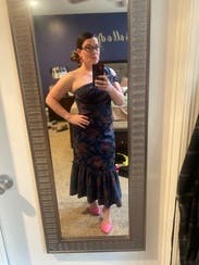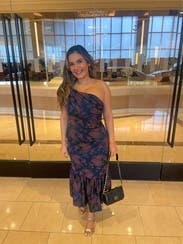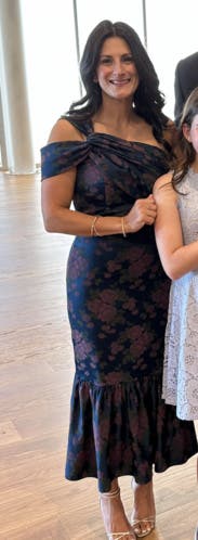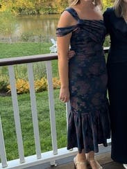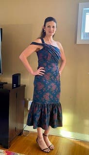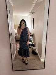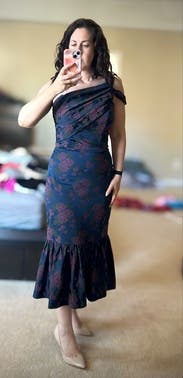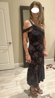 This dress was so much prettier in person. The colors and details stand out so much more than on the screen. I rented this dress for a black tie optional wedding. I ended up not going because my son got covid but the rental experience was so easy! This dress is a bit on the stiff side. I probably could have worn an 8 in the other dress I ordered, but this one has no stretch so the 10 fit perfectly. I liked the one shoulder detail but felt a tad over powered by it. Definitely a pretty dress!