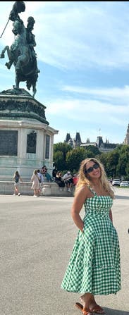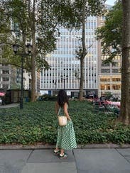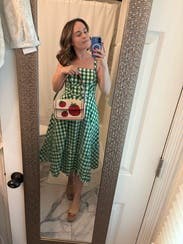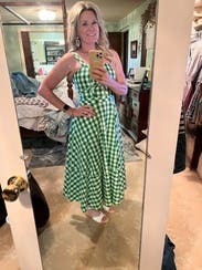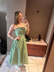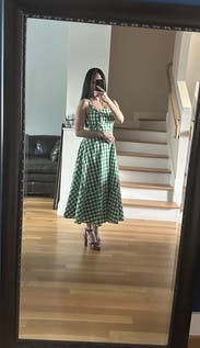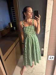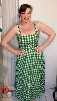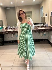 This dress was perfect for an afternoon baby shower. Light and flowy, but with a unique striking print. The green gingham was perfect for a gender neutral shower, and the sewn in bodice helped to pull everything in. Very light and airy, I loved it!