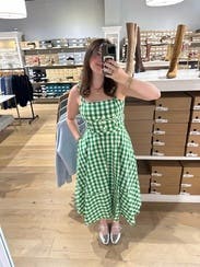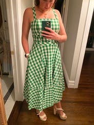 Green gingham (100% Cotton). Casual Dress. Square Neck. Sleeveless. Back zipper closure. Shoulder to hemline length: 39.5". Imported.
