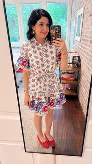 The best thing about this dress is the material. I thought it was going to be heavier because of the brand and pattern, but the dress was light and airy. You could wear it belted or unbelted, so it was super versatile. I did go up in size for the length because it is a short dress with flowy material. The shoulder seams hang off my shoulders a bit, but I don’t mind that!