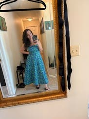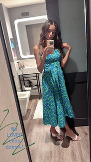 This dress was a surprise winner! I rented it because my boyfriend thought I would look great in it — and he was 100% right! I don't normally wear those colors, so I was truly skeptical. But the silhouette, the pattern, the fit… They were all an absolute dream. I wore it to a horse race track for a bridal shower, and it was the perfect choice. 10/10 would rent again!